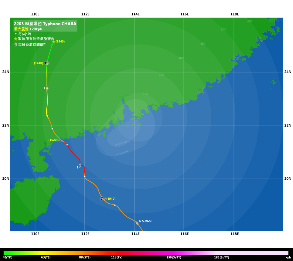 | 註:*根據香港天文台2022年熱帶氣旋年刊的文字描述,颱風暹芭於2022年7月2日上午10時最接近香港,於香港西南偏西約為310公里掠過,然而此描述與資料更詳細的最佳路徑不相符,本站經研究後認為最佳路徑資料較為可信。 |